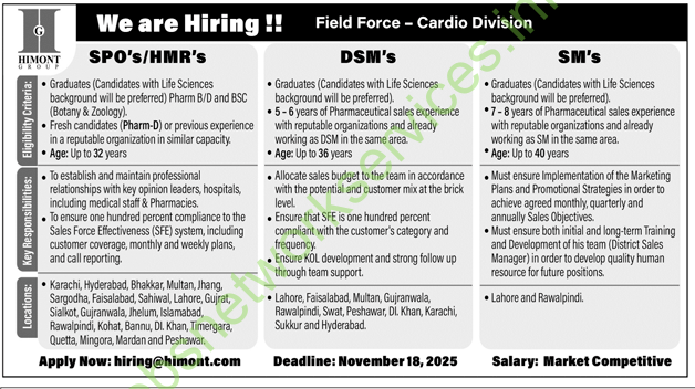 In a nutshell: Himont is looking for experienced pharmaceutical sales professionals, from representatives to managers, for its Cardio Division across Pakistan. A Life Sciences background and prior experience in a similar role are highly preferred.