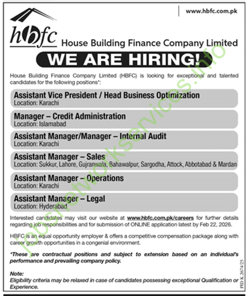 Interested candidates may visit our website at www.hbfc.com.pk/careers for further details regarding job responsibilities and for submission of ONLINE application latest by Feb 22, 2026.