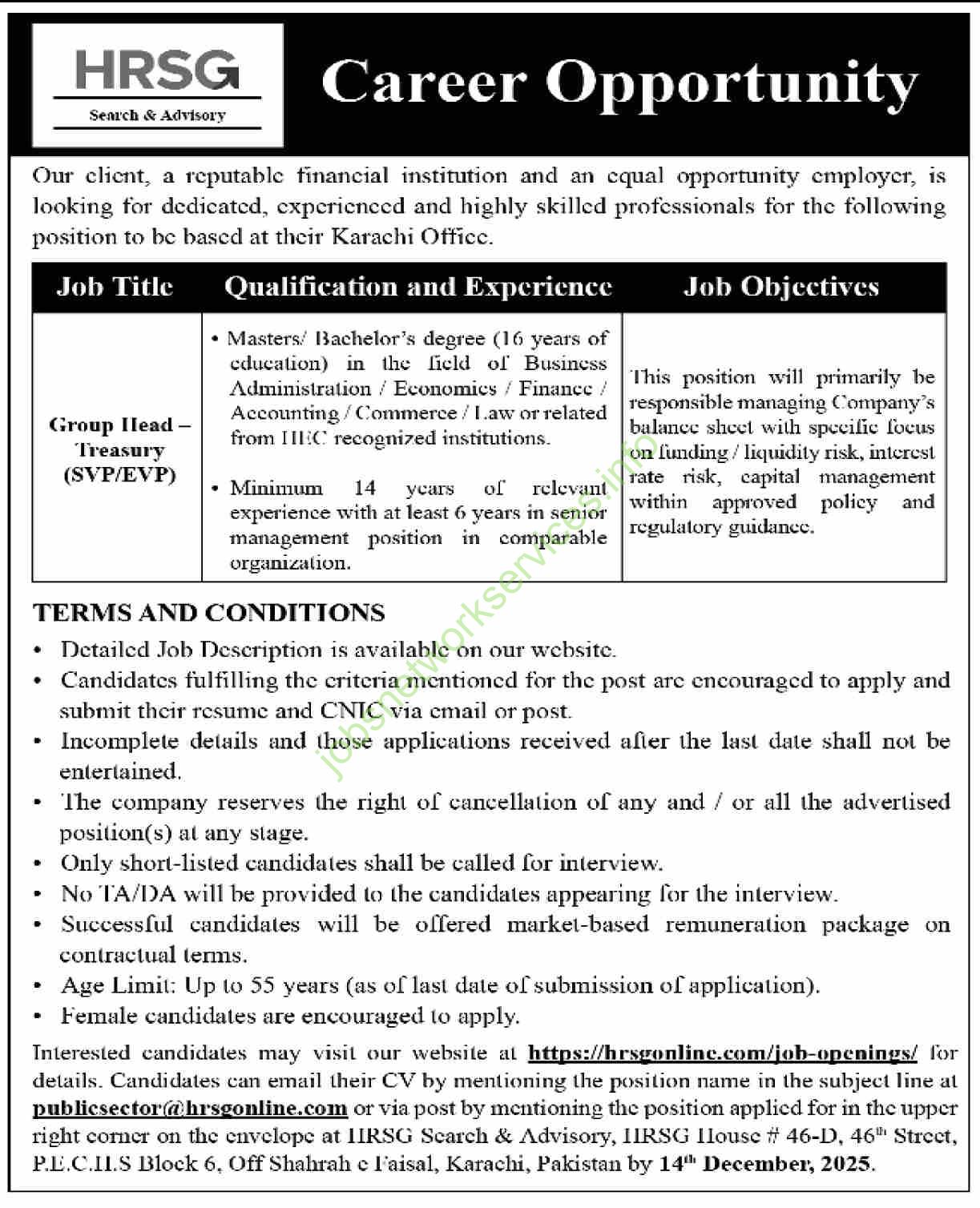 Interested candidates may visit our website at https://hrsgonline.com/job-openings/ for details. Candidates can email their CV by mentioning the position name in the subject line at publicsector@hrsgonline.com or via post by mentioning the position applied for in the upper right corner on the envelope at HRSG Search & Advisory, HRSG House # 46-D, 46th Street, P.E.C.H.S Block 6, Off Shahrah e Faisal, Karachi, Pakistan by 14th December, 2025.