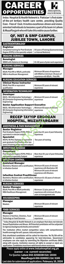 - Application Process: Apply online at indushospital.org.pk (Path: Career $\rightarrow$ Current Vacancies).