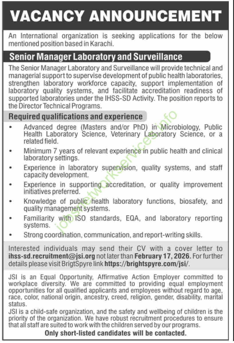 Interested individuals may send their CV with a cover letter to ihss-sd.recruitment@jsi.org not later than February 17, 2026. For further details please visit BrightSpyre link https://brightspyre.com/jsi/.