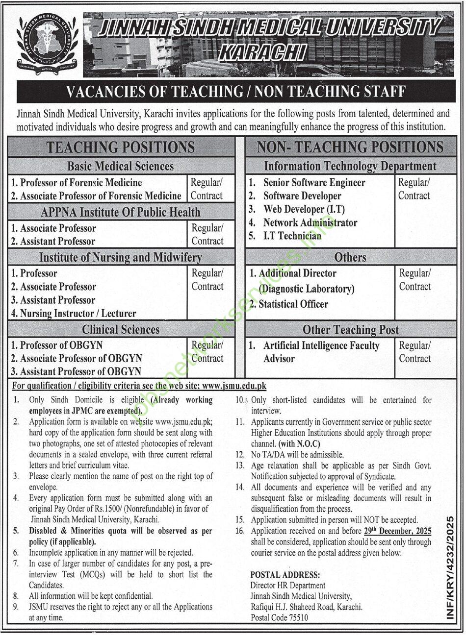 Jinnah Sindh Medical University Karachi Jobs January 2026 Latest