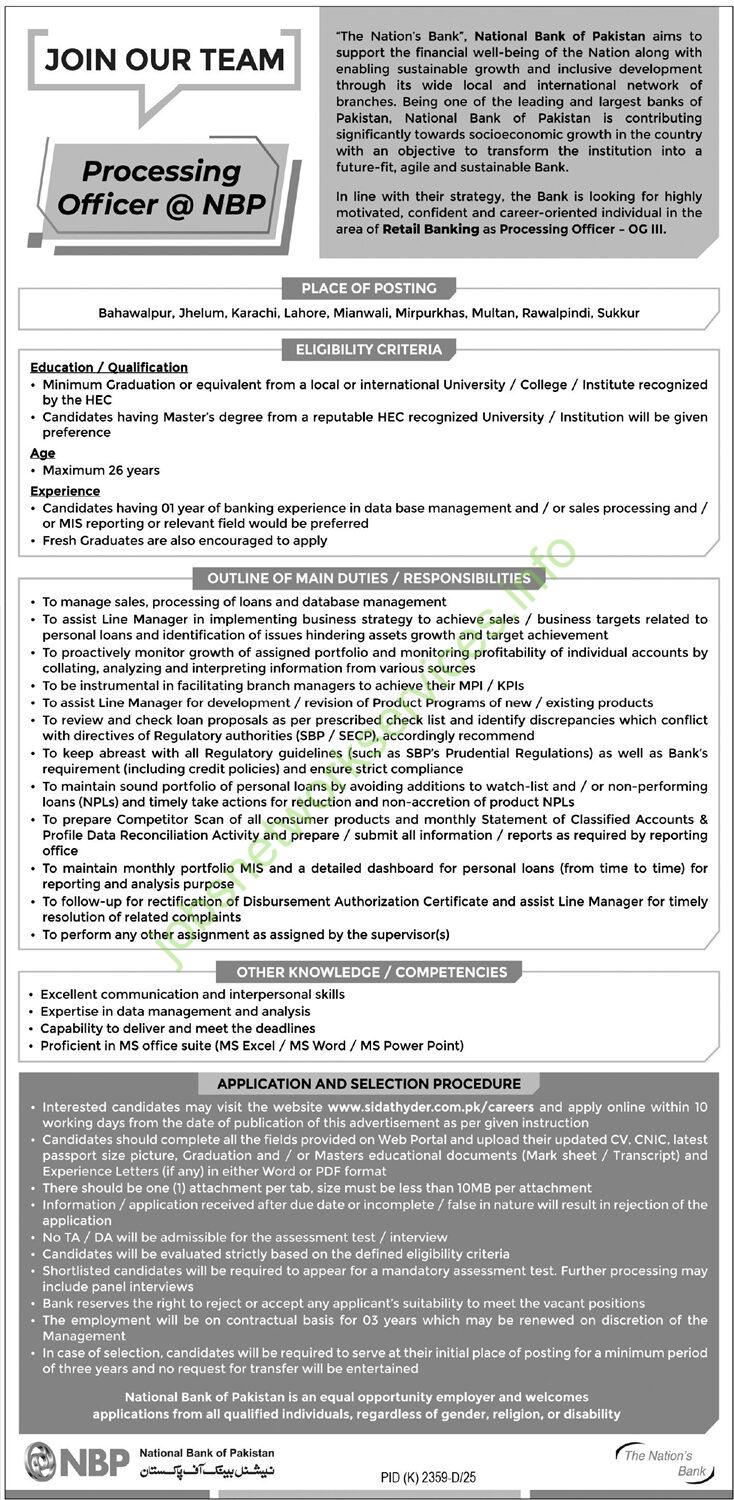 This is a comprehensive job advertisement for the position of Processing Officer (OC III) at the National Bank of Pakistan (NBP). Here’s a structured summary of the key details: