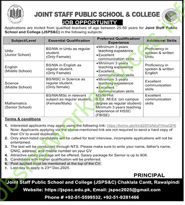 Job notice for Joint Staff Public School & College based on the text you provided: