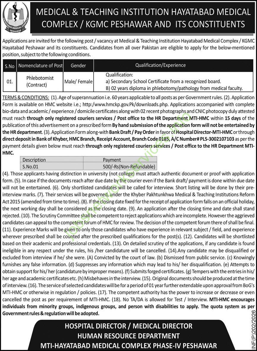 This is a job advertisement for a Phlebotomist (Contract) position at Medical & Teaching Institution Hayatabad Medical Complex / KGMC Hayatabad Peshawar and its constituents.