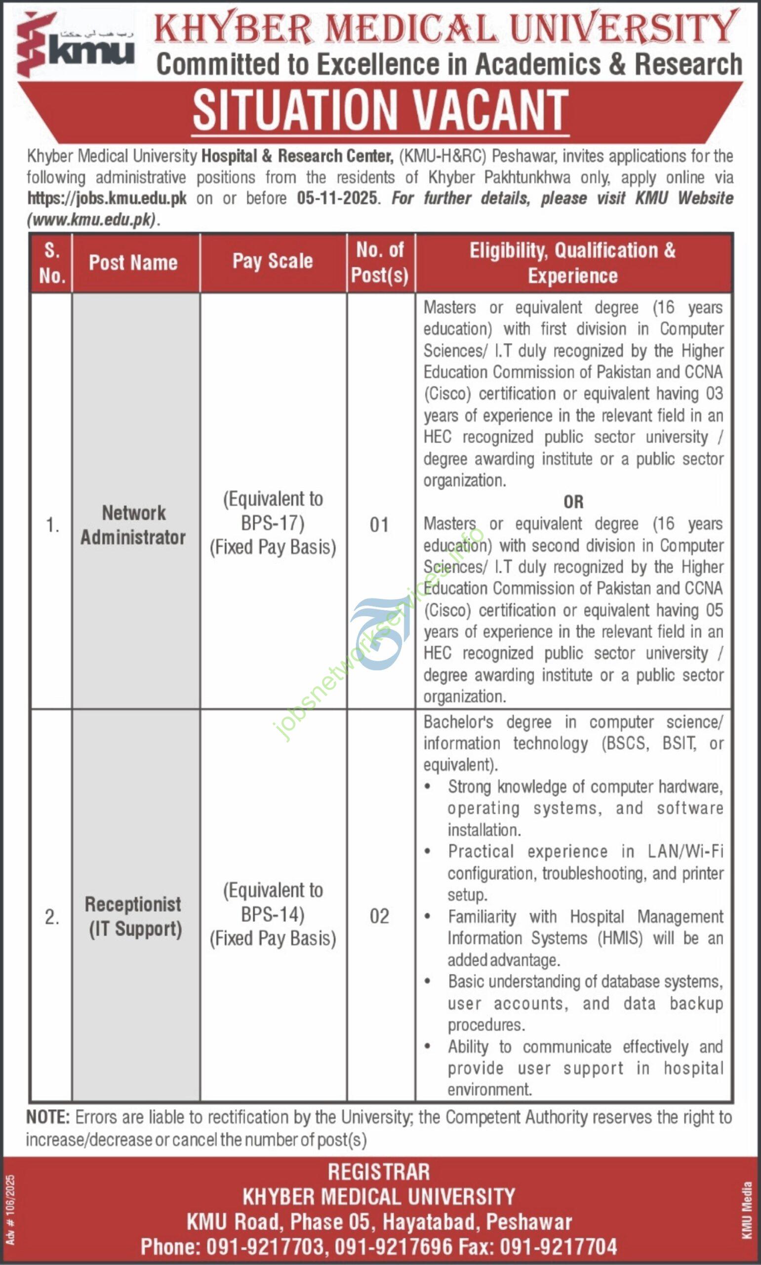 Job advertisement from Khyber Medical University.