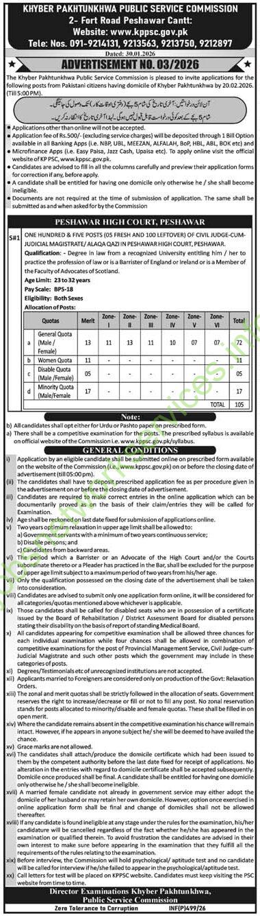 Civil Judge-cum-Judicial Magistrate / Alaqa Qazi 105 (05 Fresh, 100 Leftover) BPS-18 23 to 32 Years