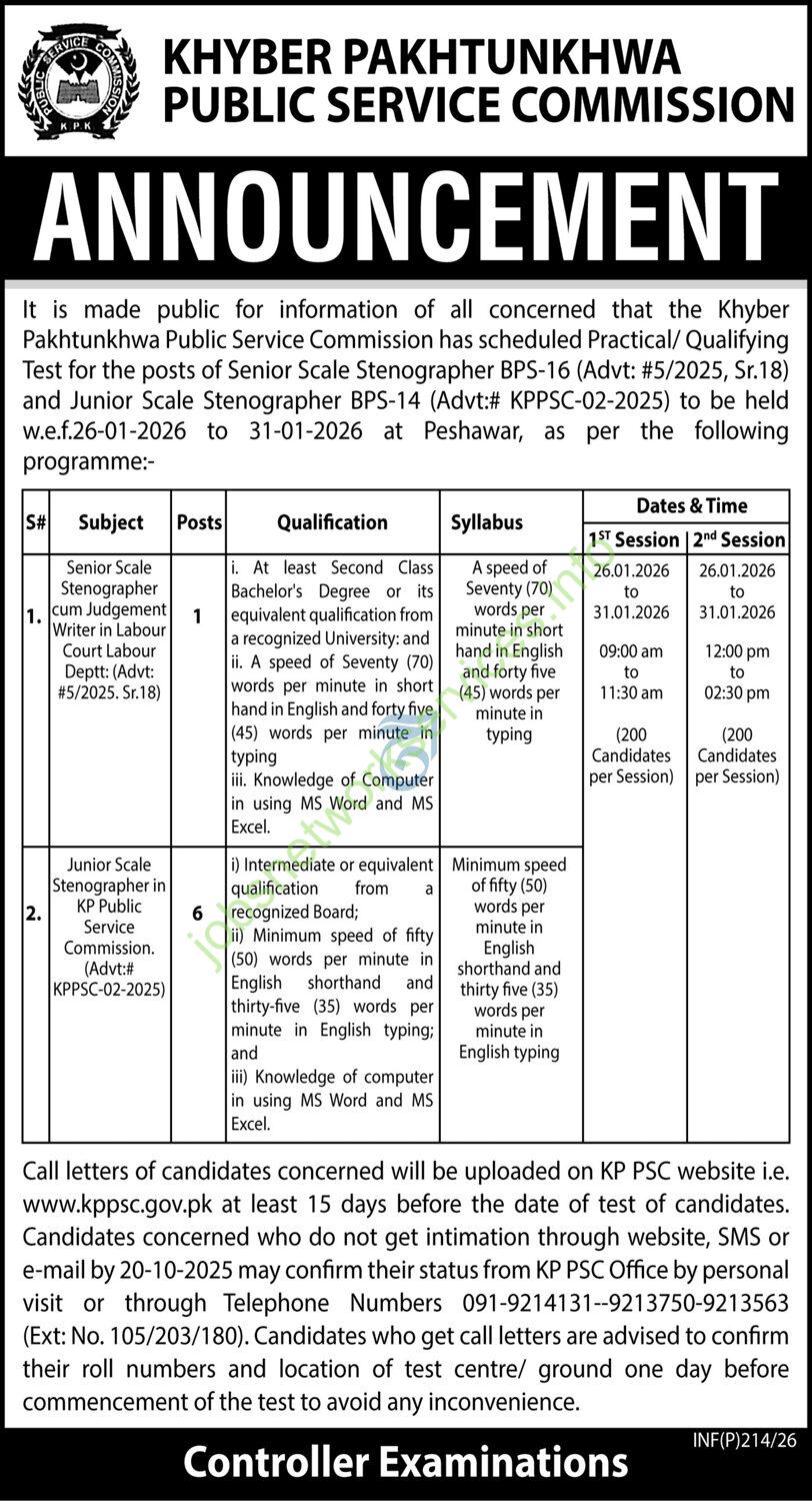 - Junior Scale Stenographer (BPS-14):6 posts (Advertisement #KPPSC-02-2025)