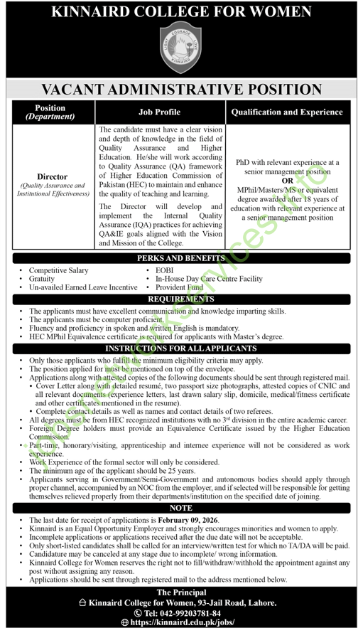 The Principal, Kinnaird College for Women, 93-Jail Road, Lahore - Only shortlisted candidates will be contacted (no TA/DA).