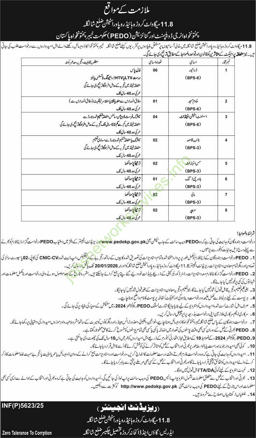 1۔ PEDO درخواست دہندہ گان کے ڈیٹا فارم کو مکمل طور پر پر کریں اور خط شدہ تمام دستاویزات کی تصدیق شدہ کاپیوں کے ساتھ، تجربے کے سرٹیفکیٹس، اپ ڈیٹ شدہ CNIC، CV کی کاپی، 02 پاسپورٹ سائز کی تصاویر اور دیگر تمام معاون دستاویزات ریزیڈنٹ انجینئر 11.8 میگاواٹ کروڑہ ہائیڈرو پاور اسٹیشن ضلع شانگلہ کو مورخہ 20/01/2026 تک یا قبل ارسال کریں۔
