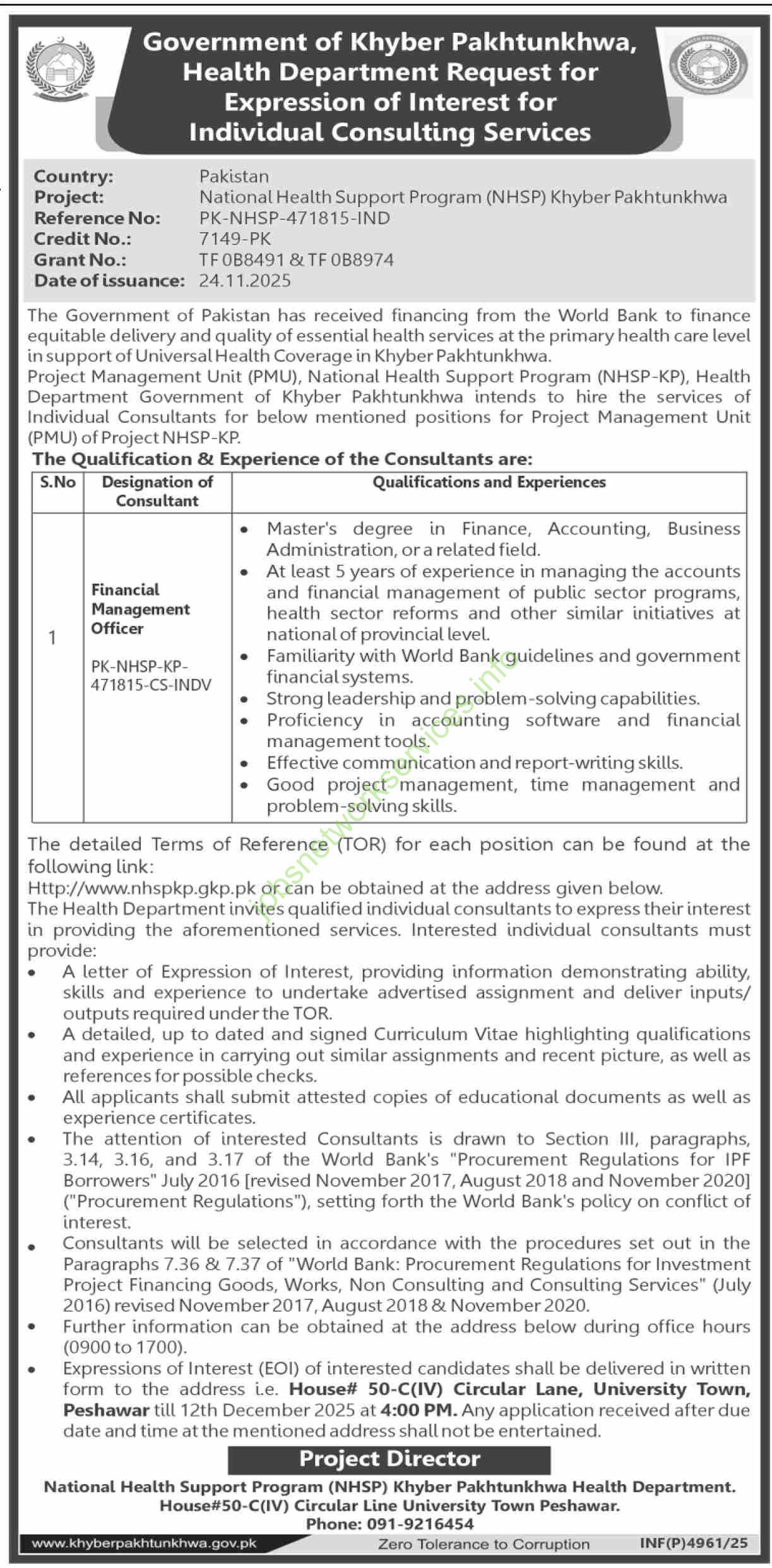 The Health Department of Khyber Pakhtunkhwa is hiring for a Financial Management Officer position. This is a consulting role funded by the World Bank under the National Health Support Program (NHSP). The application deadline is December 12, 2025, at 4:00 PM.