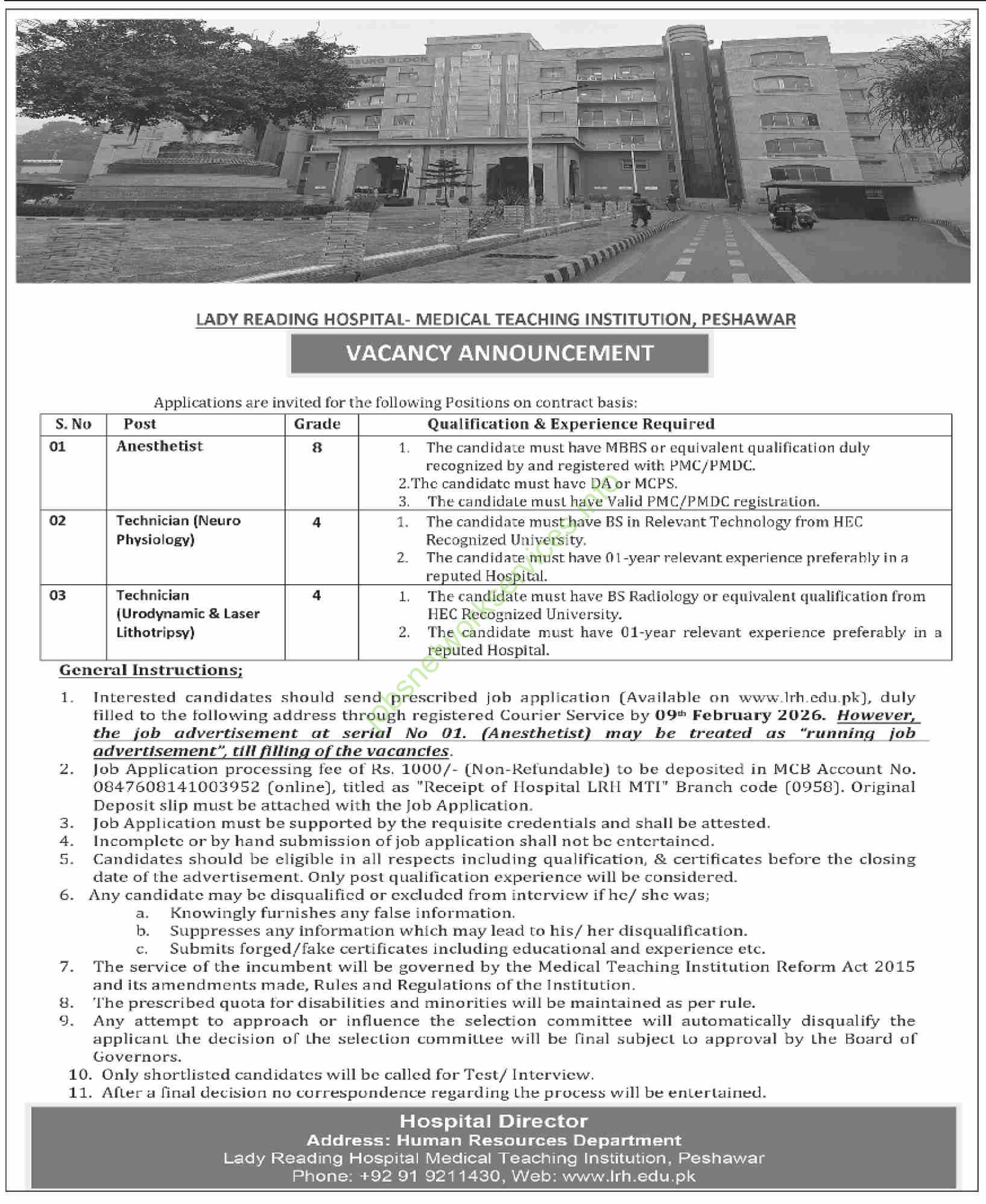 Here’s a structured summary of the job advertisement from Lady Reading Hospital Medical Teaching Institution (LRH MTI), Peshawar: