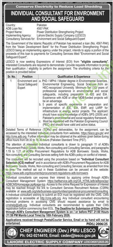 The Government of the Islamic Republic of Pakistan has received a loan (No. 4567-PAK) from the “Asian Development Bank” for the Power Distribution Strengthening Project. LESCO being an implementing agency under the project, intends to apply a portion of the proceeds of this loan to payments for Consulting Services titled “Environment and Social Safeguard Expert”.