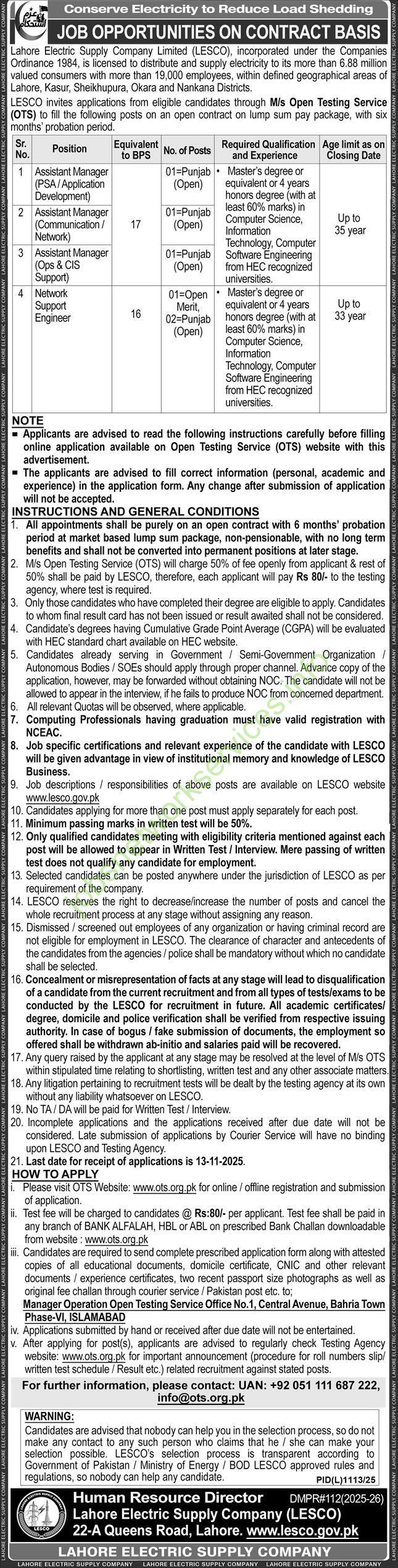LESCO is hiring for three contract-based positions. Applications must be submitted through the Open Testing Service (OTS) by April 13, 2025. Candidates must have a relevant 16-year Master’s degree and be under 35 years of age.