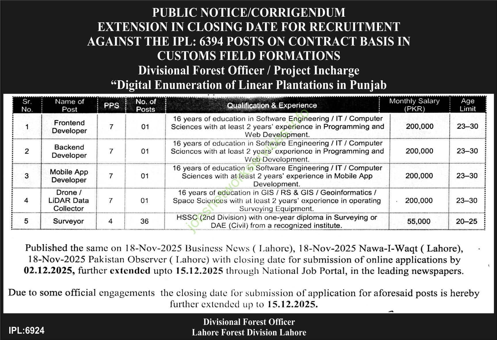 This is a public notice from the Lahore Forest Division regarding a deadline extension for job applications.