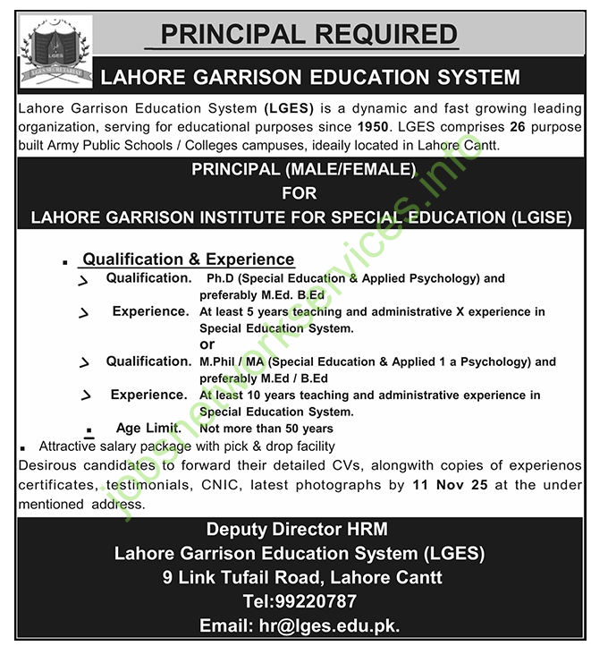 Job Advertisement: Principal at Lahore Garrison Education System (LGES)