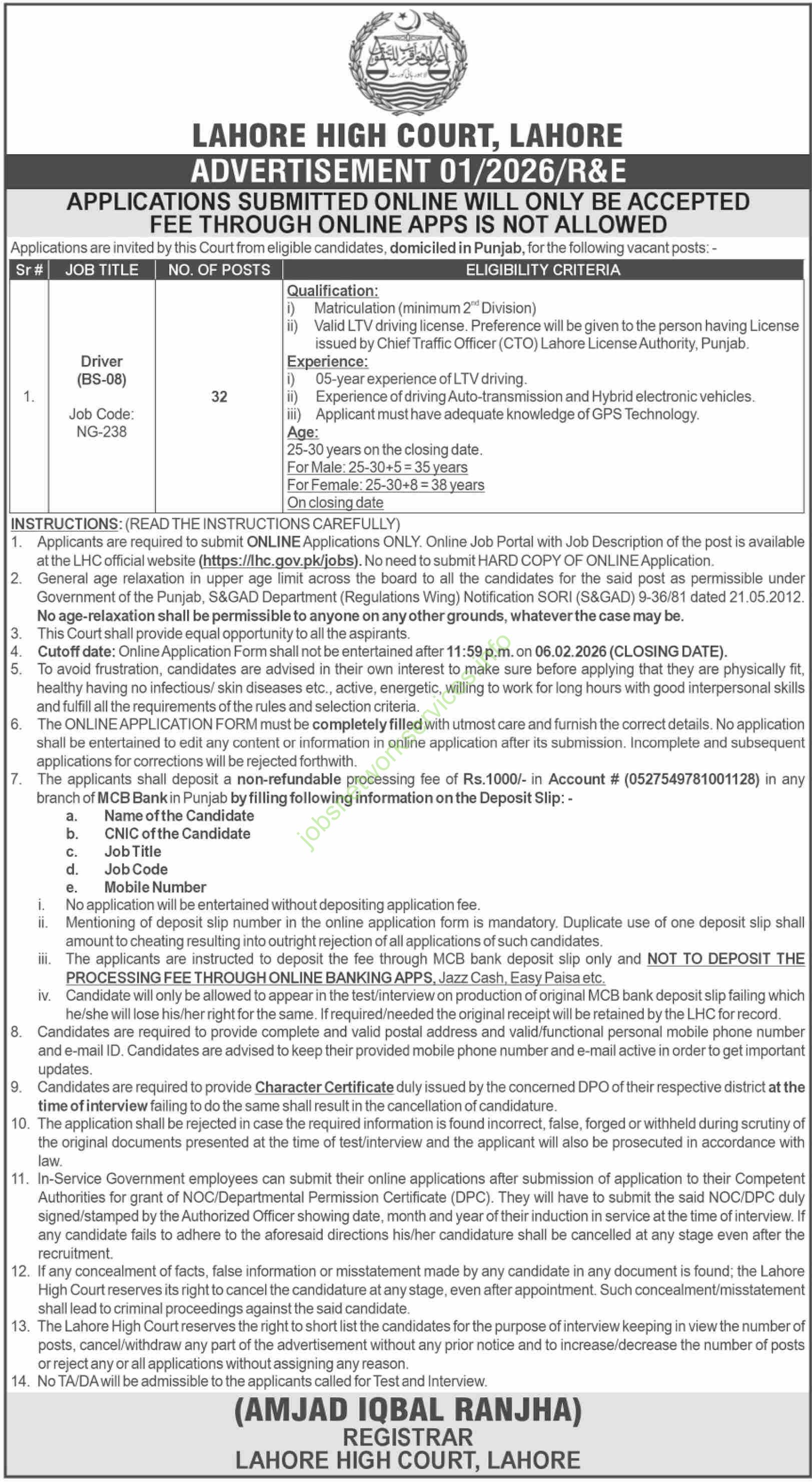 Based on the Lahore High Court job advertisement, here’s a summary and key points for potential applicants:
