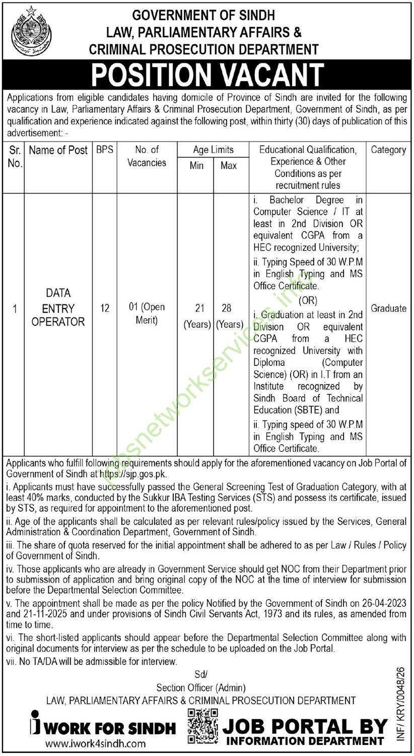This appears to be a job advertisement from the Government of Sindh, Law, Parliamentary Affairs & Criminal Prosecution Department, inviting applications for the position of Data Entry Operator (BPS-12).