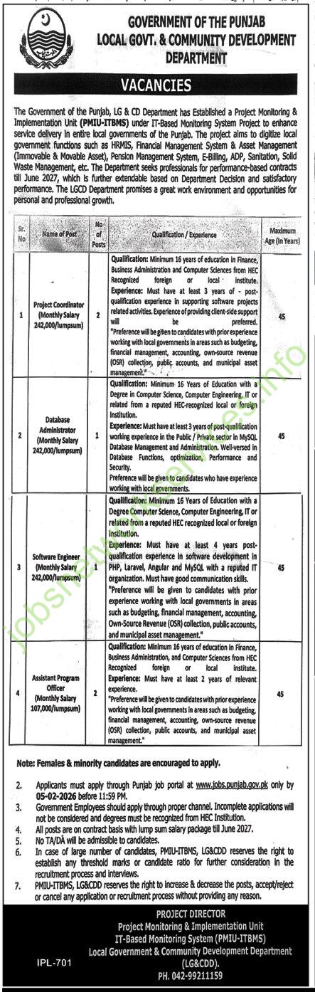 The Government of the Punjab, LG & CD Department has Established a Project Monitoring & Implementation Unit (PMIU-ITBMS) under IT-Based Monitoring System Project to enhance service delivery in entire local governments of the Punjab. The project aims to digitize local government functions such as HRMIS, Financial Management System & Asset Management (Immovable & Movable Asset), Pension Management System, E-Billing, ADP, Sanitation, Solid Waste Management, etc. The Department seeks professionals for performance-based contracts till June 2027, which is further extendable based on Department decision and satisfactory performance. The LGCD Department promises a great work environment and opportunities for personal and professional growth.