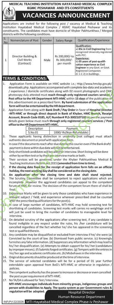 - Application Fee: A bank draft/pay order of Rs. 1000/- in favor of the Hospital Director, MTI-HMC, must be deposited in a specified Bank of Khyber account.