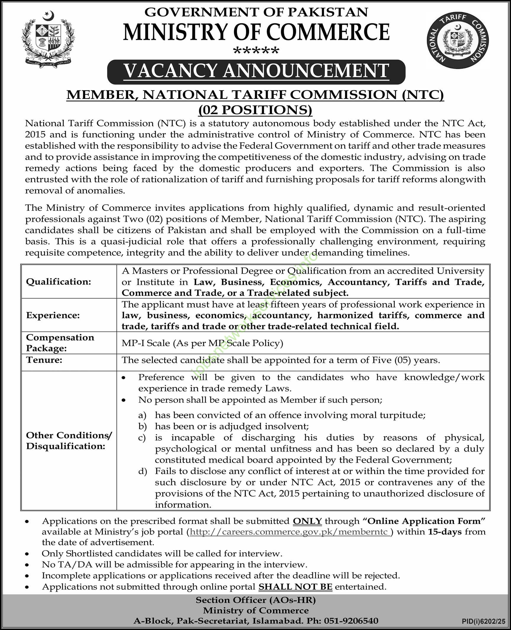 - Applications on the prescribed format shall be submitted ONLY through “Online Application Form” available at Ministry’s job portal (http://careers.commerce.gov.pk/memberntc) within 15-days from the date of advertisement.