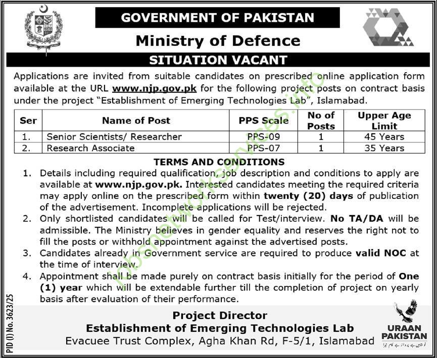 The Ministry of Defence, Government of Pakistan, is hiring for two project-based contract positions for the “Establishment of Emerging Technologies Lab” in Islamabad.