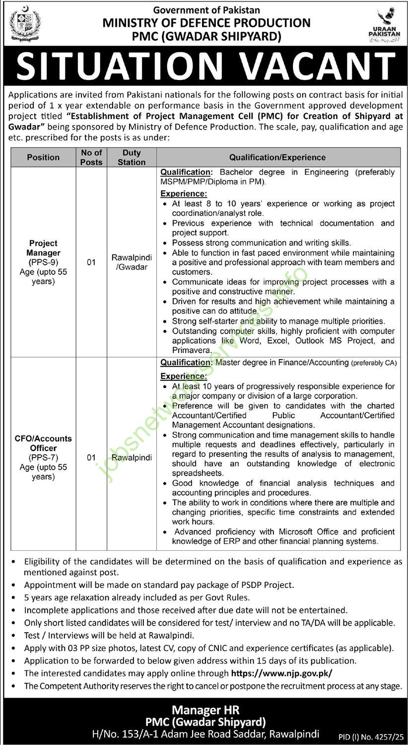 The Government of Pakistan’s Ministry of Defence Production is hiring for two key positions within the Project Management Cell (PMC) for the Gwadar Shipyard project. These are contract-based roles for an initial period of one year, extendable based on performance.