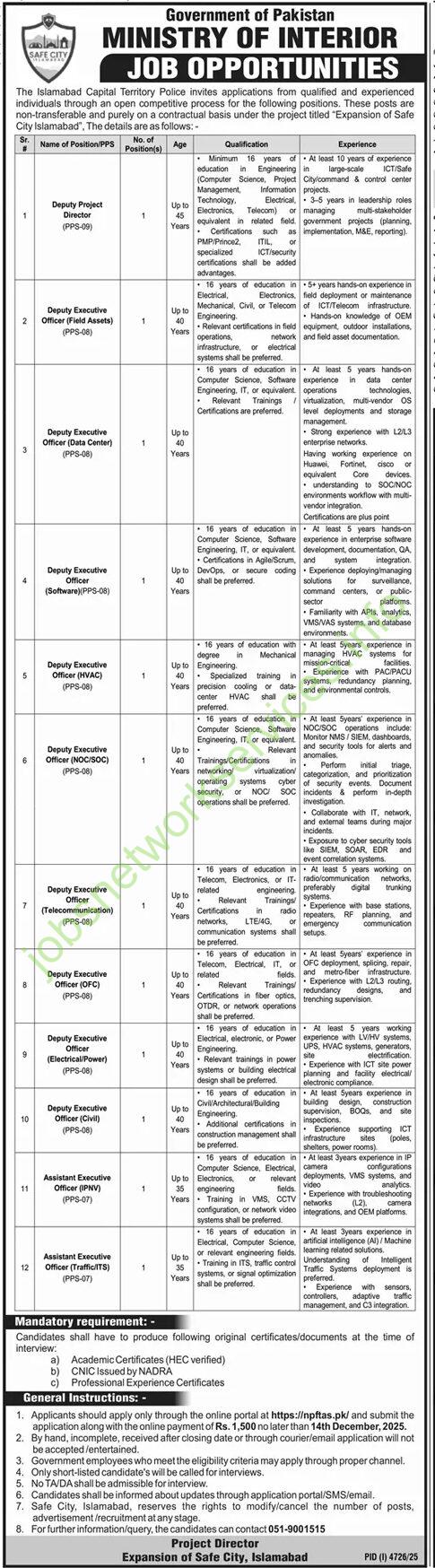 | 1. | Deputy Project Director (PPS-09) | 1 | Up to 55 Years | BE/B.Sc Engineering (Computer, Software, Electronics, Telecom, Electrical) or equivalent recognized by HEC/PEC. MS/M.Phil preferred. | At least 10 years in project management, design, and execution of large-scale ICT/Telecom projects. Experience with Safe City expansion is preferred. |