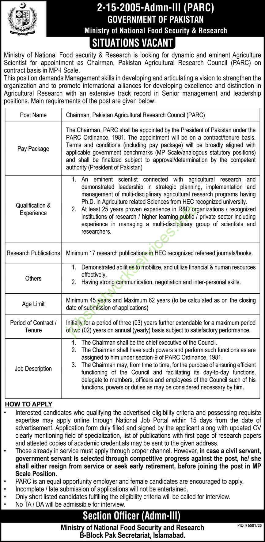 Ministry of National Food Security & Research is looking for dynamic and eminent Agriculture Scientist for appointment as Chairman, Pakistan Agricultural Research Council (PARC) on contract basis in MP-I Scale.