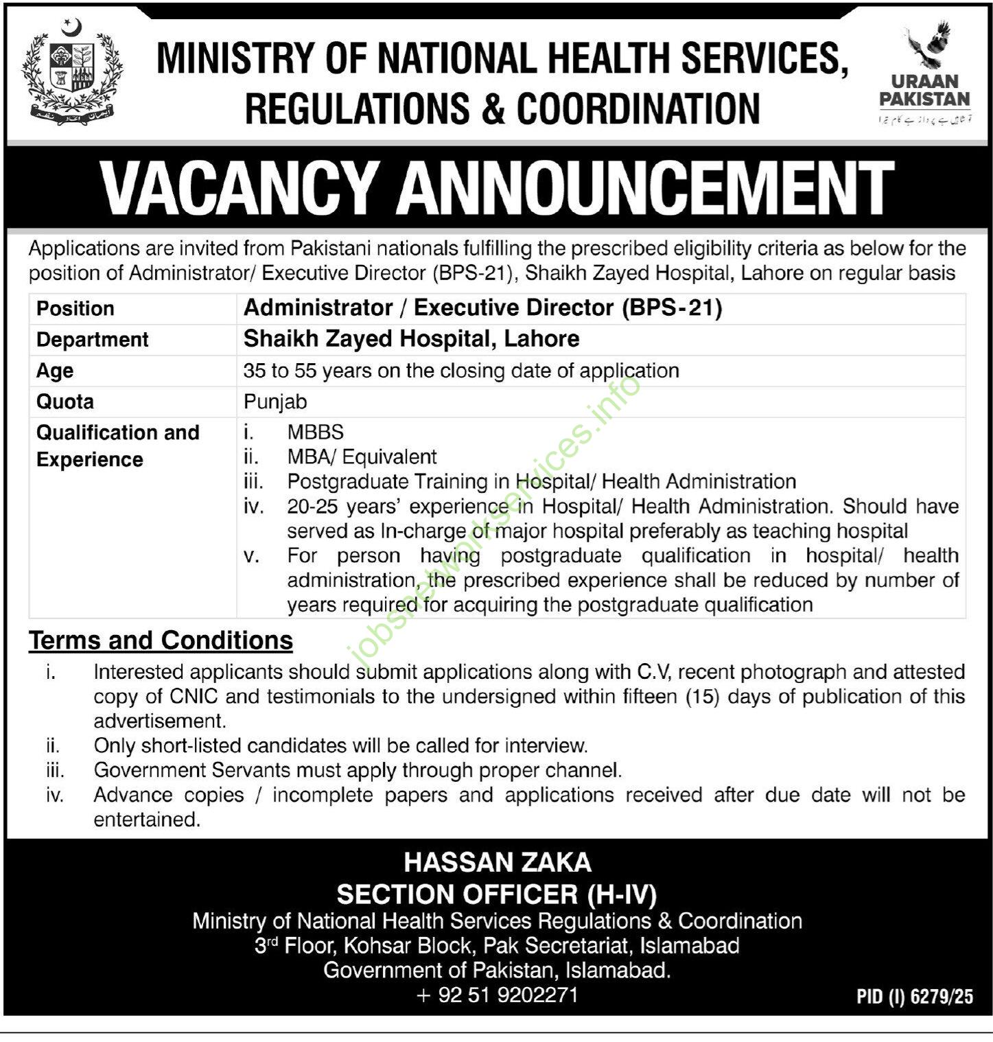 Applications are invited from Pakistani nationals fulfilling the prescribed eligibility criteria as below for the position of Administrator/ Executive Director (BPS-21), Shaikh Zayed Hospital, Lahore on a regular basis.