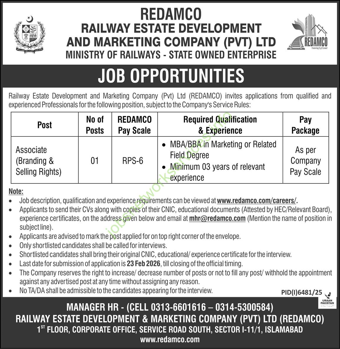 This image contains a job advertisement for REDAMCO (Railway Estate Development and Marketing Company (Pvt) Ltd), a state-owned enterprise under the Ministry of Railways.