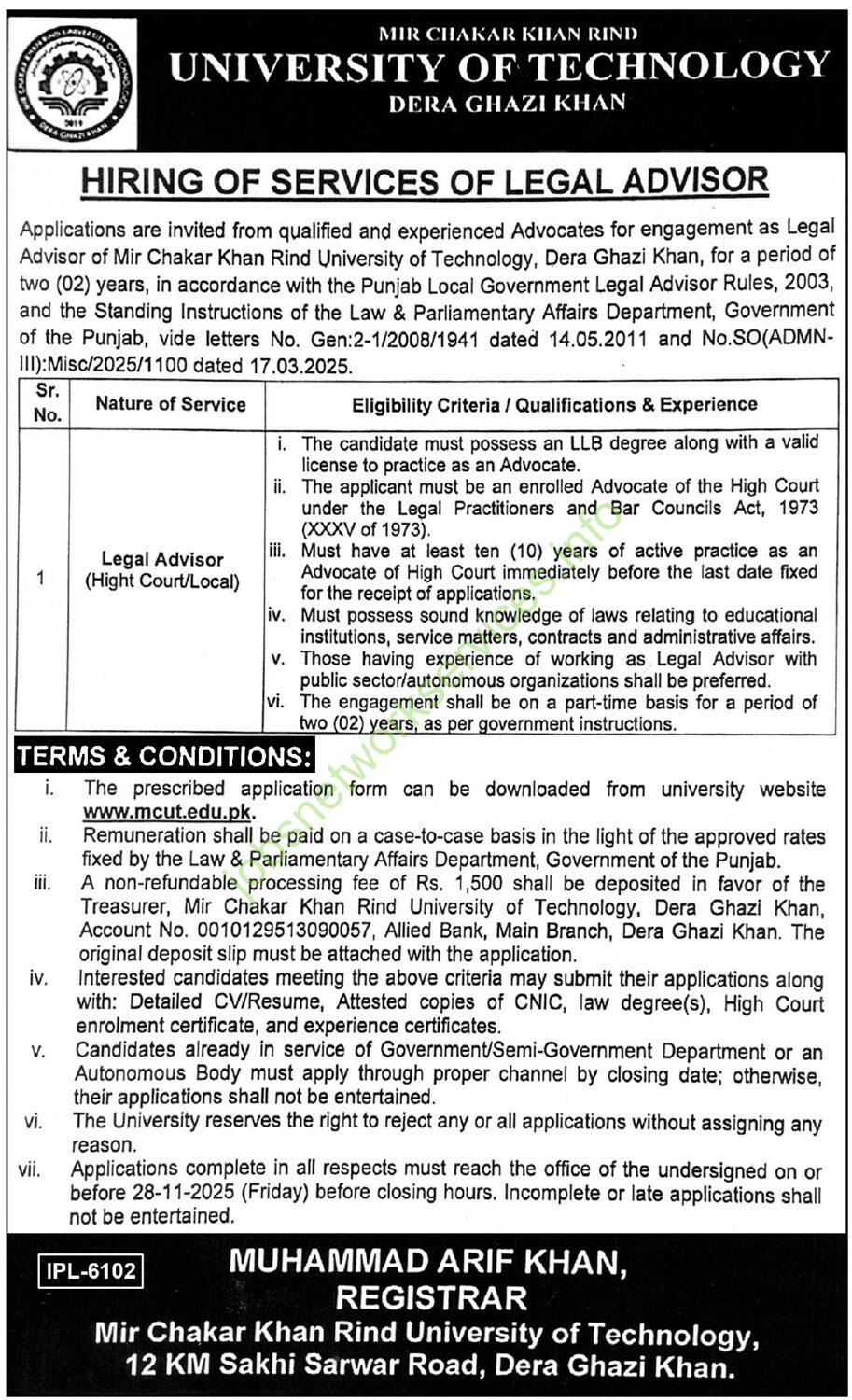 Job advertisement for the Legal Advisor position at Mir Chakar Khan Rind University of Technology.