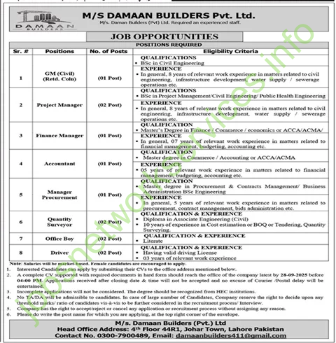 MS Damaan Builders Pvt Ltd Lahore Jobs 2025