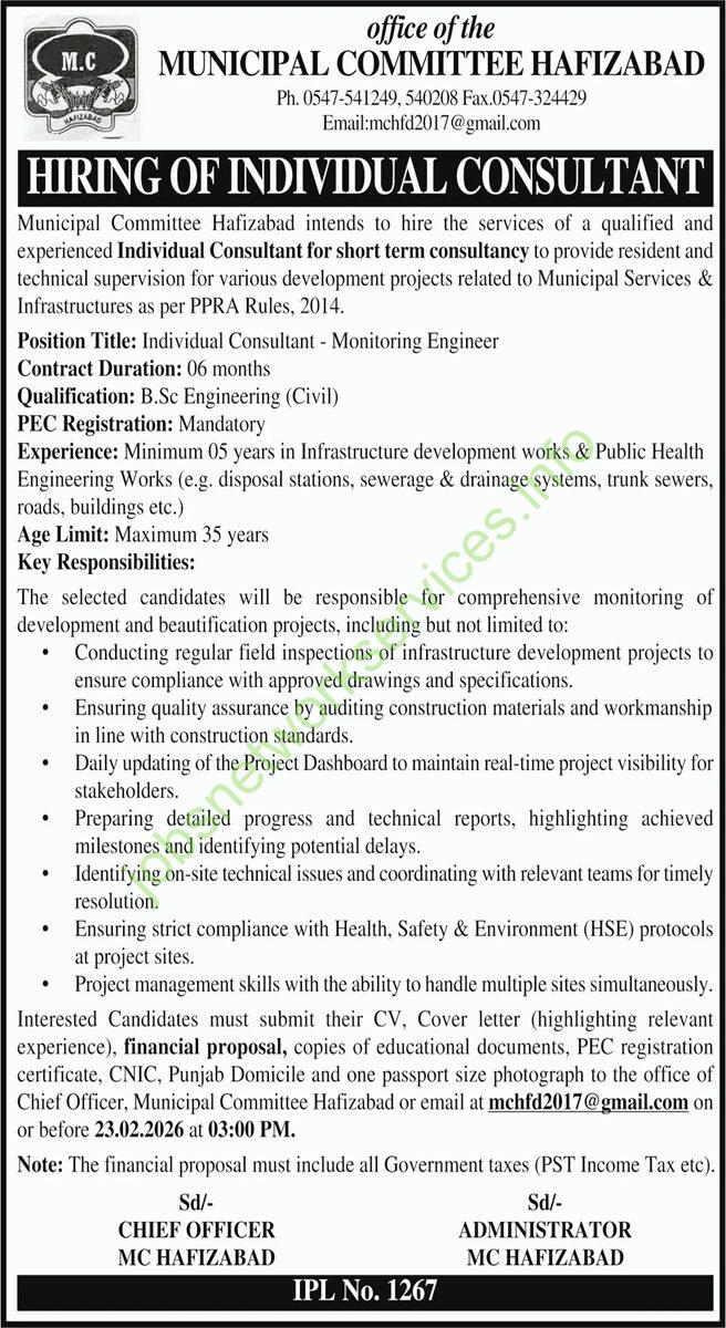 The Municipal Committee Hafizabad intends to hire the services of a qualified and experienced Individual Consultant for short-term consultancy to provide resident and technical supervision for various development projects related to Municipal Services & Infrastructures as per PPRA Rules, 2014.