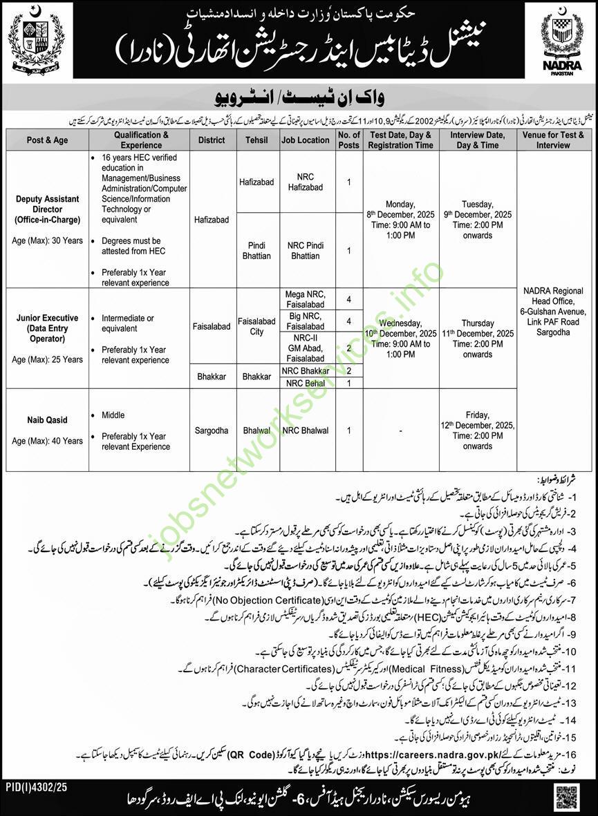 Deputy Assistant Director (Office-in-Charge) Age (Max): 30 Years 16 years HEC verified education in Management/Business Administration/Computer Science/Information Technology or equivalent Degrees must be attested from HEC Preferably 1x Year relevant experience Hafizabad Hafizabad NRC Hafizabad 1 Monday, 8th December, 2025 Time: 9:00 AM to 1:00 PM Tuesday, 9th December, 2025 Time: 2:00 PM onwards NADRA Regional Head Office, 6-Gulshan Avenue, Link PAF Road Sargodha