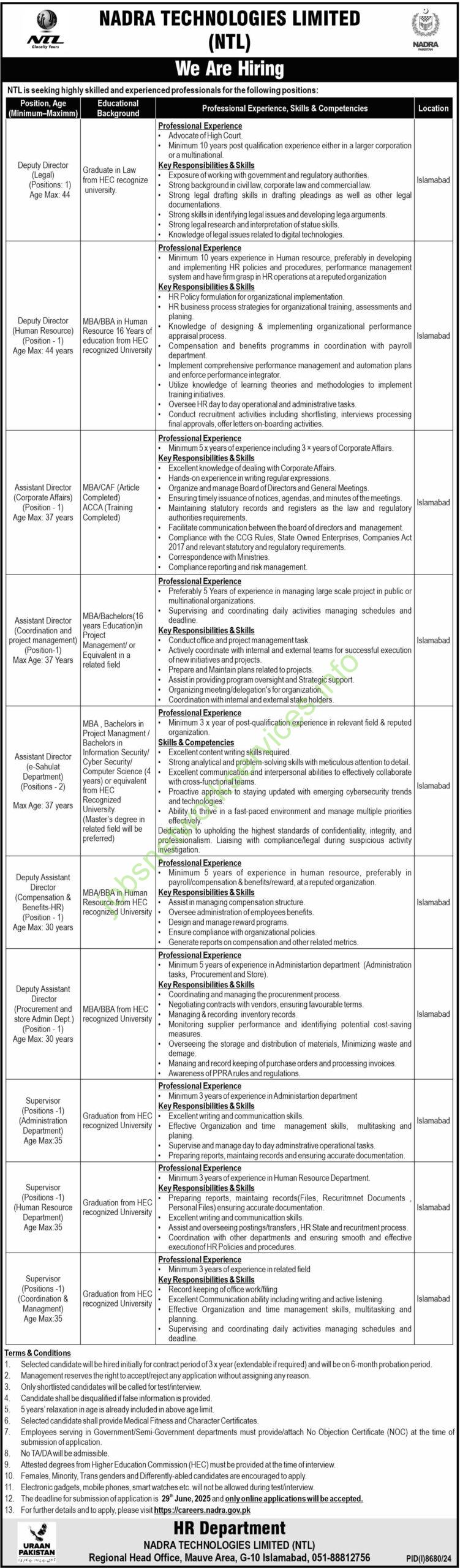 Nadra Technologies Limited NTL Jobs 2025 Career Opportunities Latest Apply Online Latest Pakistan Jobs –– Pakistan Today Jobs 2025 has been announced through the advertisement and applications from the NTL Jobs 2025 Today Jobs 2025 the eligible Male/Female candidates from across the country can apply through the procedure defined by the organization and can get these Today Jobs in Pakistan 2025 after the complete recruitment Process.