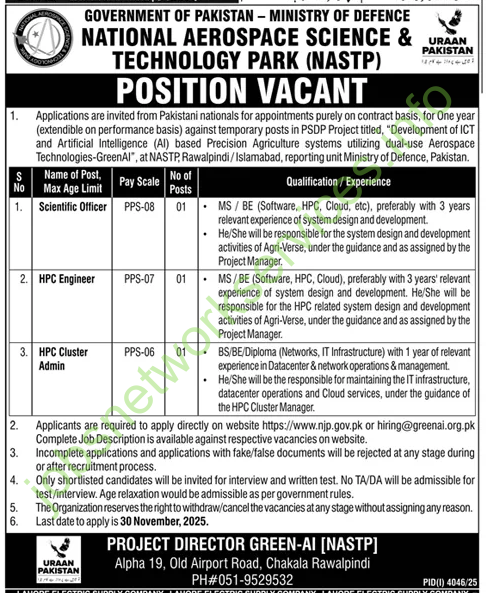 The Government of Pakistan’s Ministry of Defence is hiring for contract-based positions within the “GreenAI” project, which focuses on developing AI-based precision agriculture systems using aerospace technology.