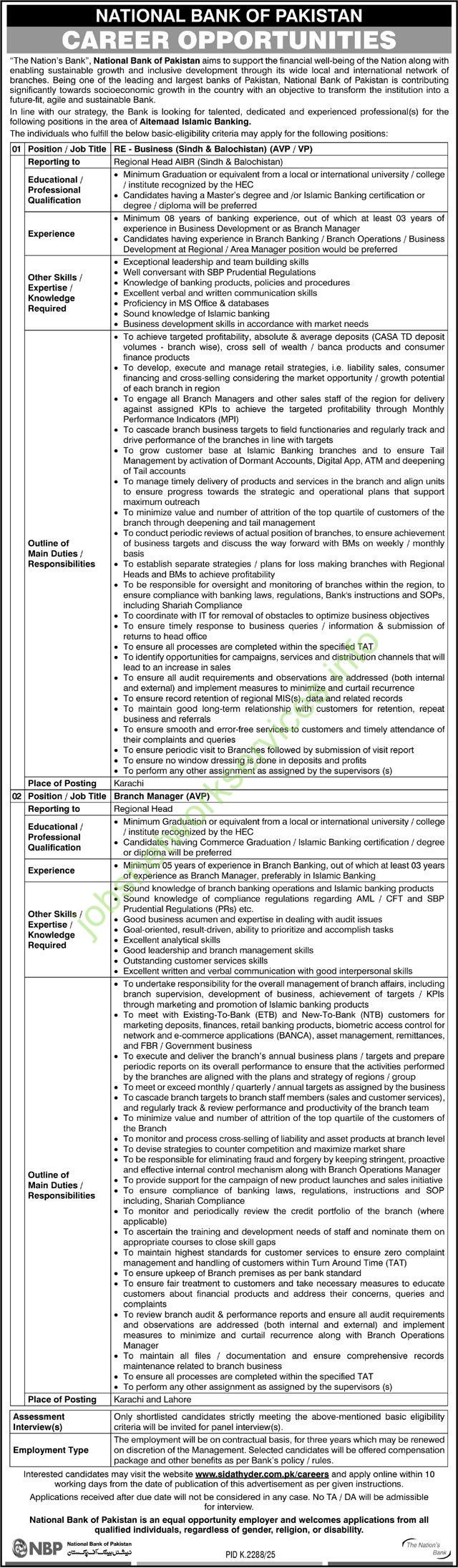 NBP is seeking experienced Branch Managers on a 3-year contract(extendable) for its branches across Pakistan. Two slightly different grades are advertised: AVP and VP. - Key Qualifications & Experience: