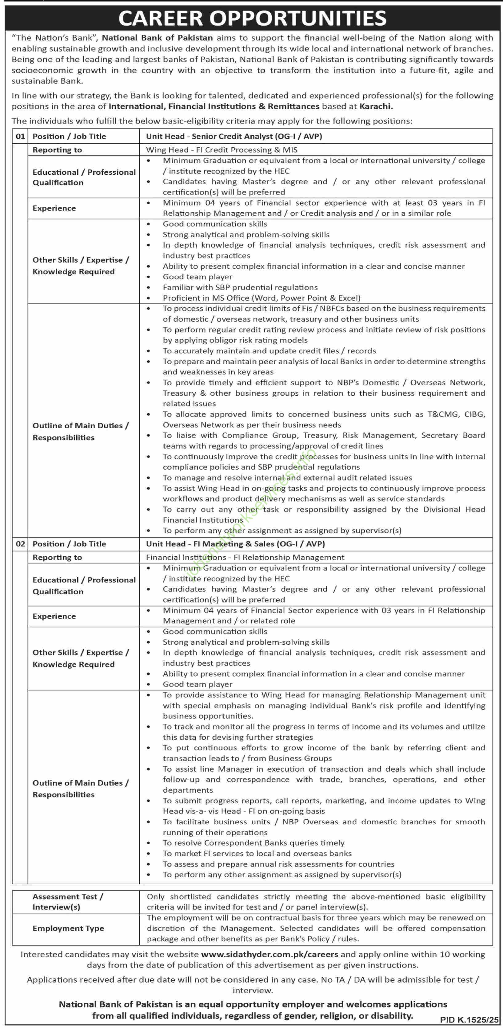 The National Bank of Pakistan (NBP) is hiring for two senior positions within its International, Financial Institutions & Remittances division in Karachi. These are contractual roles for three years, requiring a minimum of 4 years of financial sector experience.
