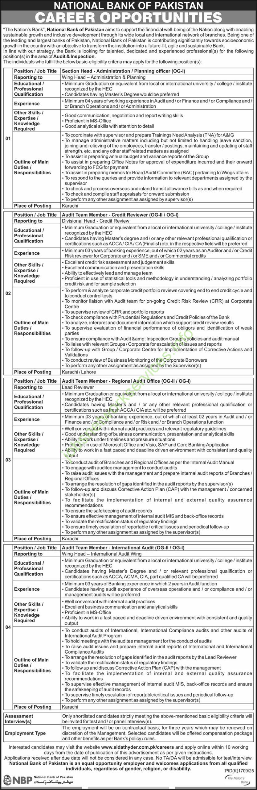 Career opportunities advertised by the National Bank of Pakistan (NBP).