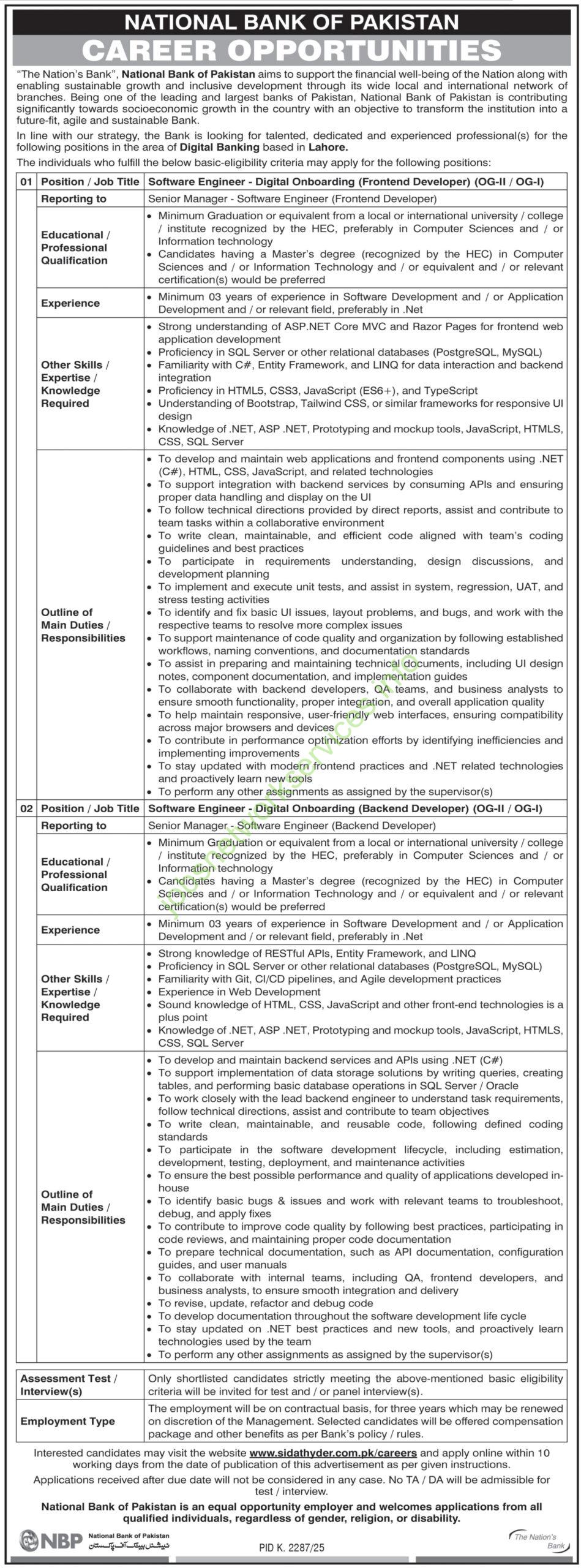 Job advertisements from the National Bank of Pakistan (NBP) for the year 2026. Here is a combined summary of both:
