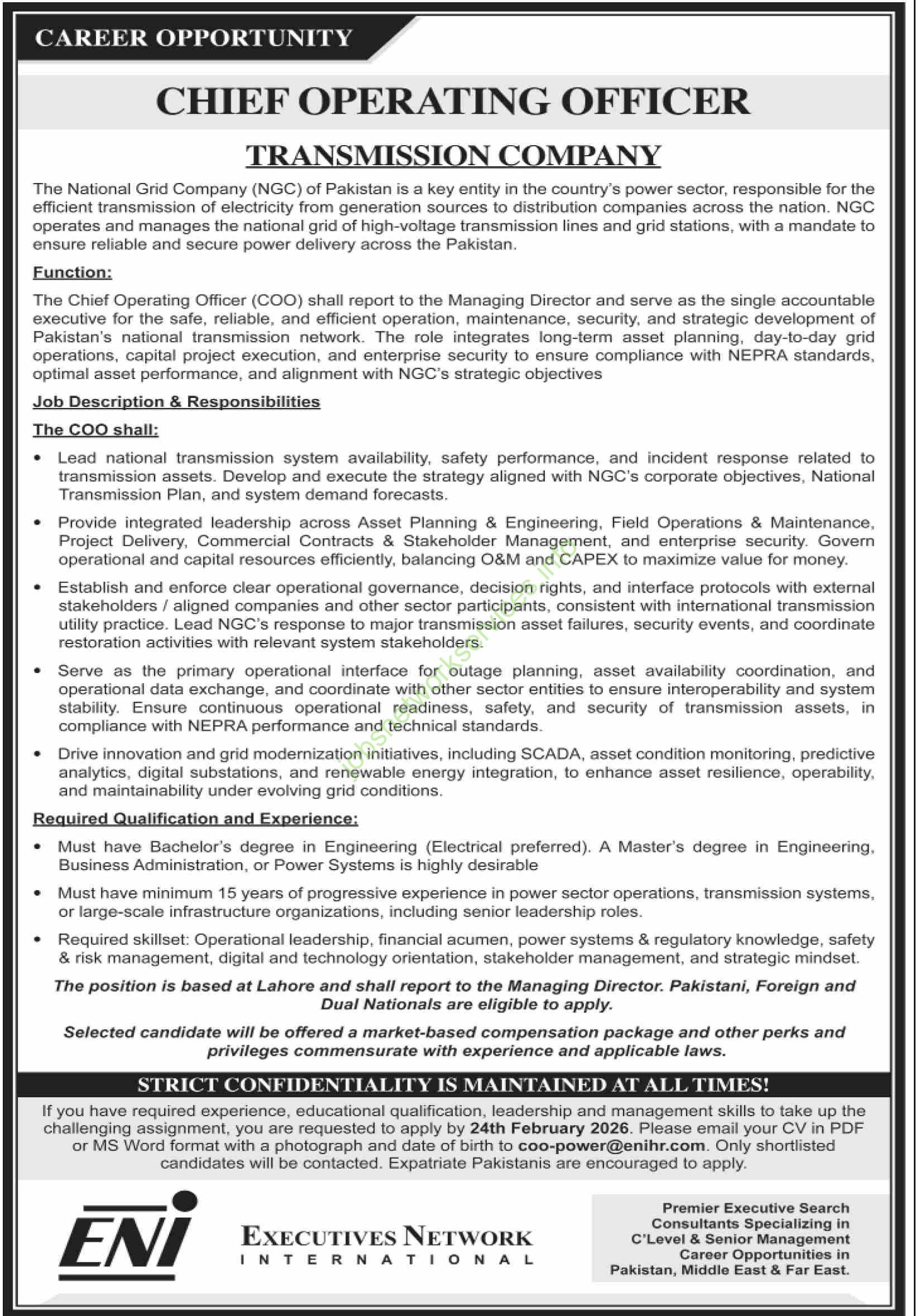 - Must have minimum 15 years of progressive experience in power sector operations, transmission systems, or large-scale infrastructure organizations, including senior leadership roles.