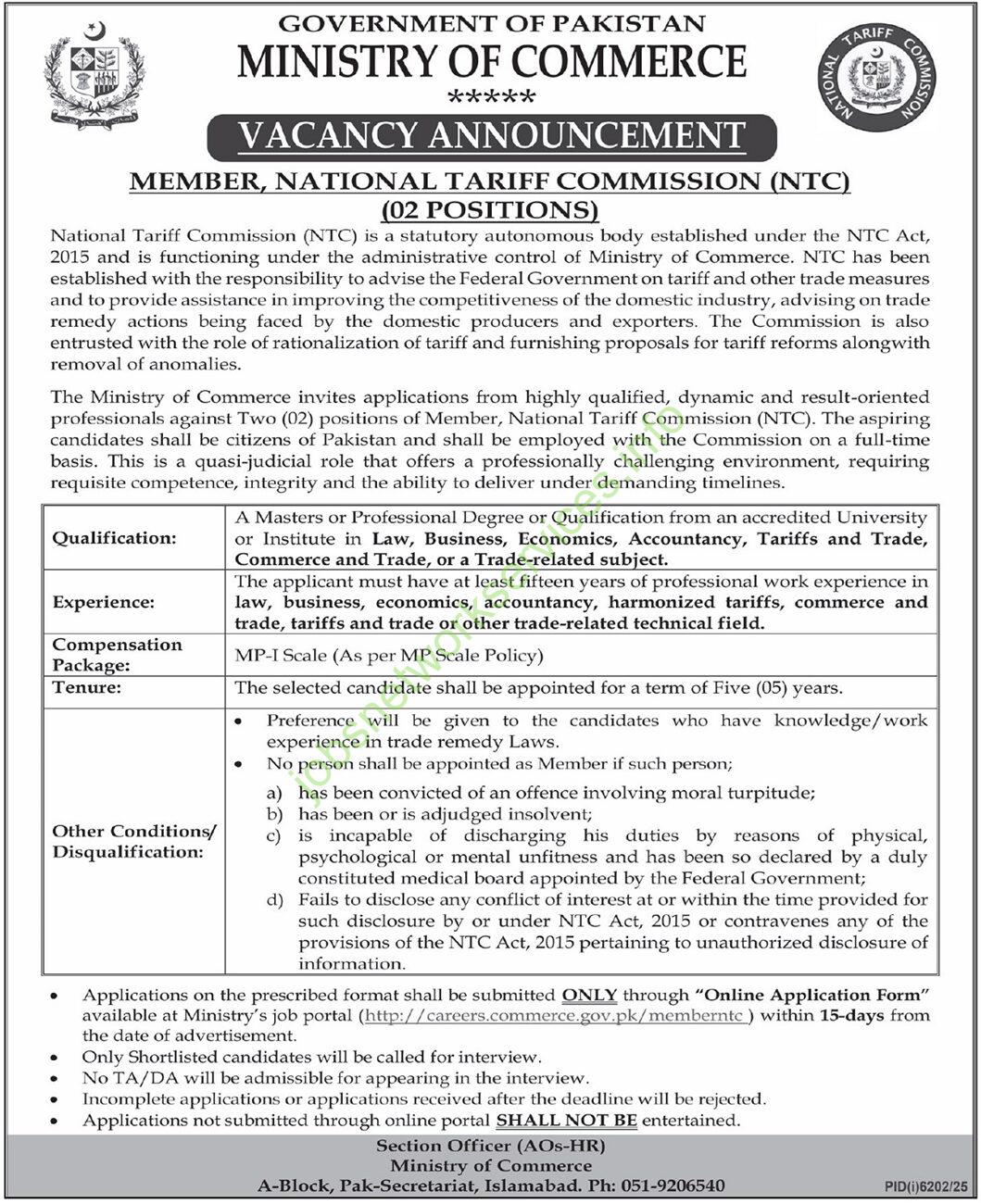 - Applications on the prescribed format shall be submitted ONLY through “Online Application Form” available at Ministry’s job portal: http://careers.commerce.gov.pk/memberntc within 15-days from the date of advertisement.