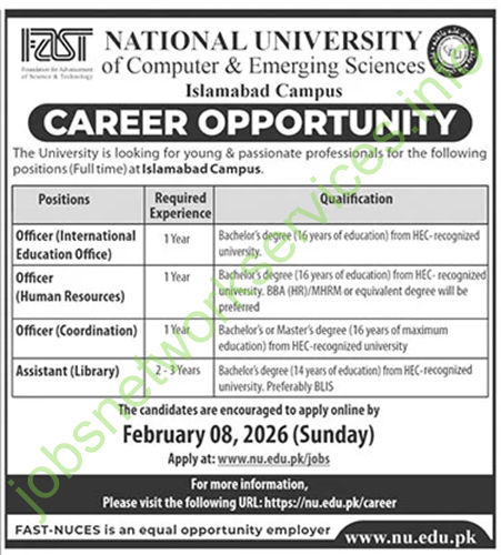 Apply online at: www.nu.edu.pk/jobs