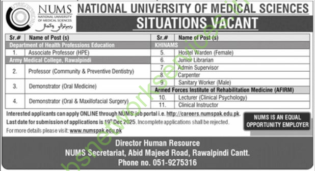 National University of Medical Sciences NUMS Jobs December 2025 Latest