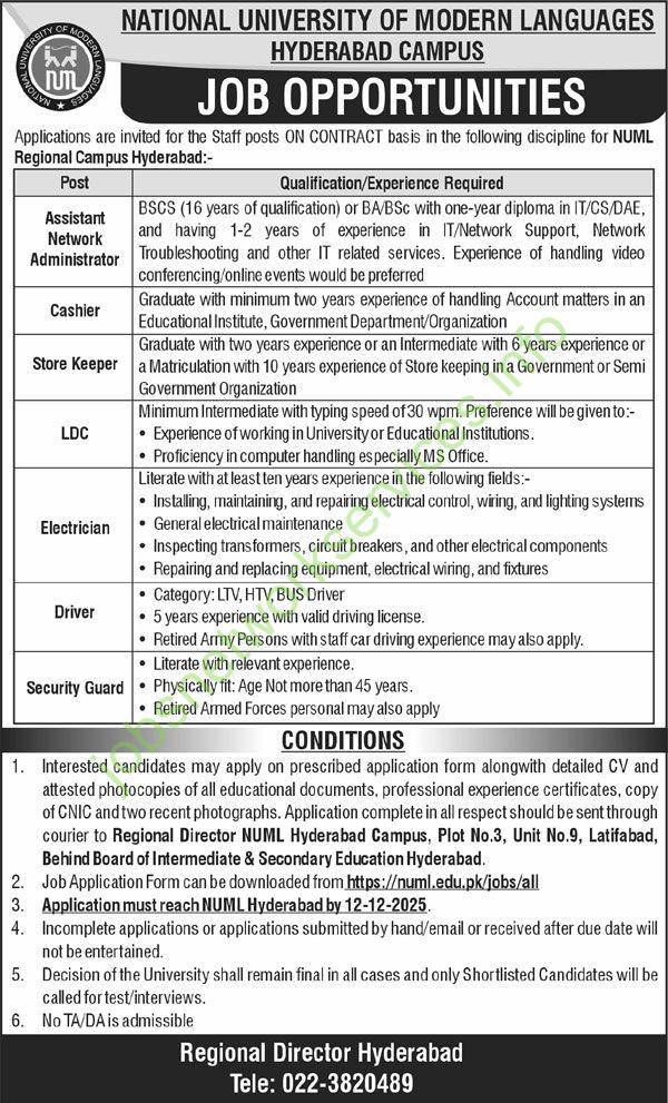 The National University of Modern Languages (NUML), Hyderabad Campus, is inviting applications for several staff positions on a contract basis. The application deadline is December 12, 2025.