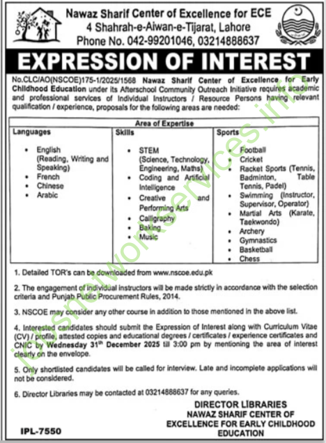 Nawaz Sharif Center of Excellence for ECE Lahore Jobs 2025 Latest