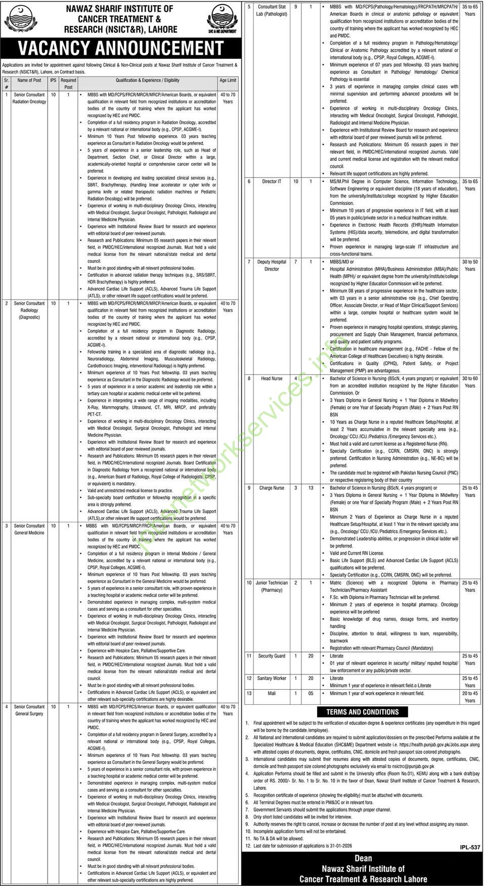 Applications are invited for appointment against following Clinical & Non-Clinical Posts at Nawaz Sharif Institute of Cancer Treatment & Research (NSICT&R), Lahore.