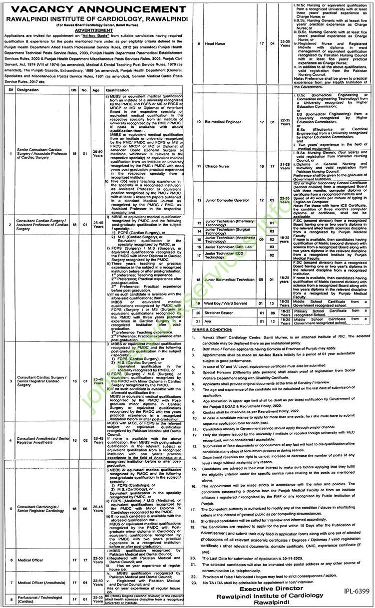 Vacancy announcement from the Rawalpindi Institute of Cardiology.