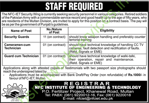 Job advertisement from NFC Institute of Engineering and Technology in Multan. The ad lists several security-related positions open for retired Pakistan Army personnel. The user hasn’t explicitly asked a question, so I need to infer what they might need.